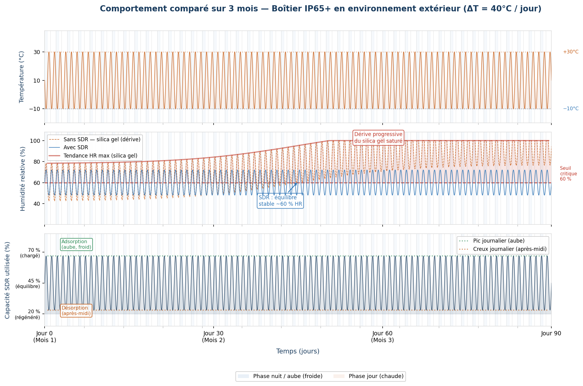 Figure 3 — Dérive hygrométrique du silica gel saturé vs stabilité du SRD sur 90 jours de cycles thermiques (ΔT = 40°C/jour).